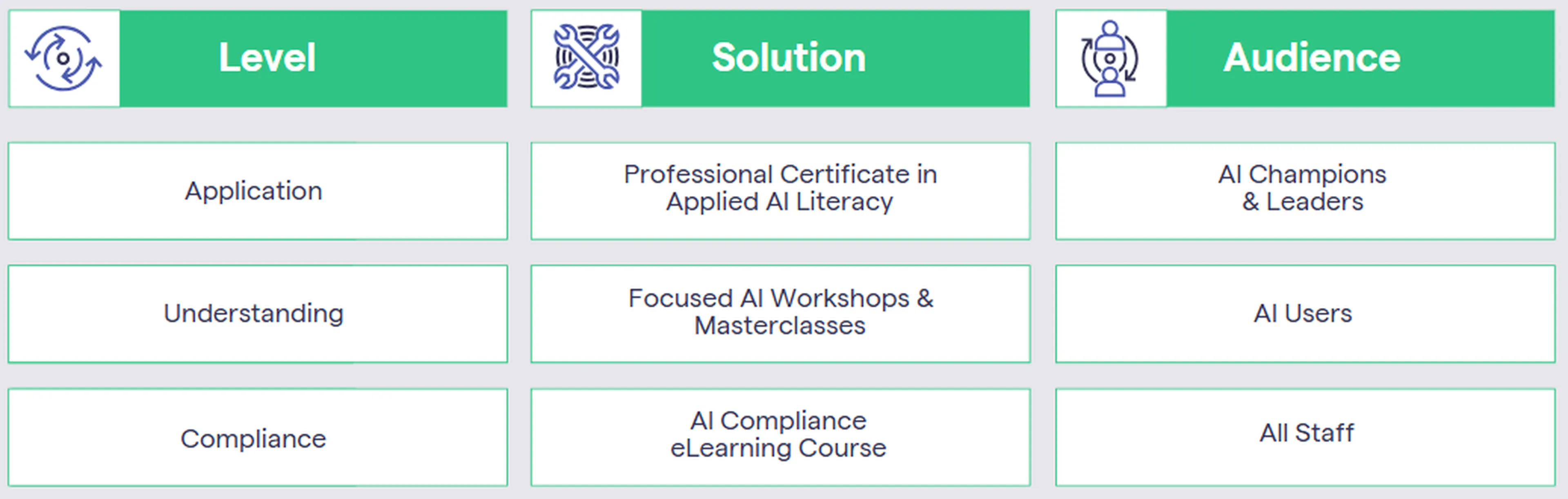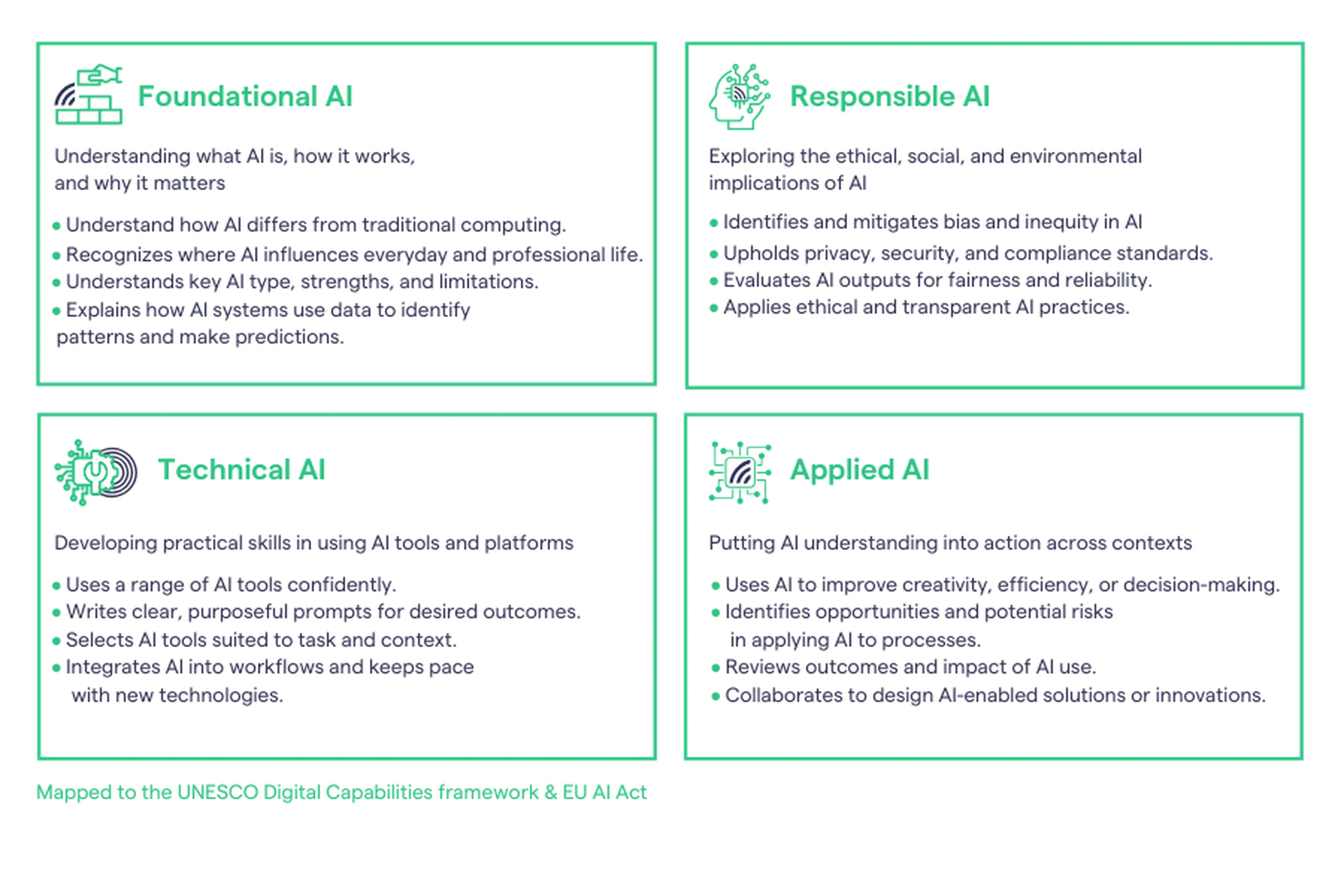Using the framework, we help you build learning pathway that align compliance, capability development, and responsible applied use of AI in real work.